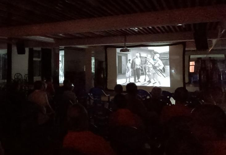 因为小雨时断时续,赵光和同伴们把放映机从室外搬进了一楼餐厅,挂上银幕。老人们很快闻讯而来,不一会儿工夫,这个有着大约30个座位的临时影院就几乎被坐满了。老人们拉着话,屋里热闹起来。