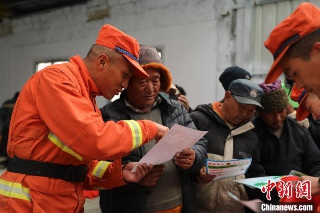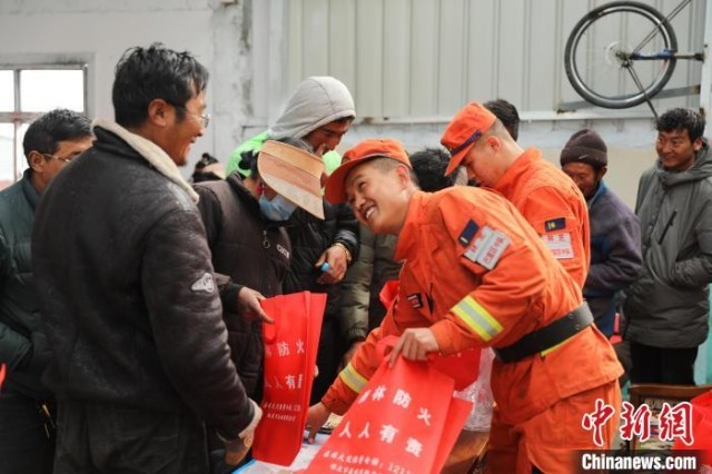 为民众分发防火宣传小礼品。 西绕拉翁 摄