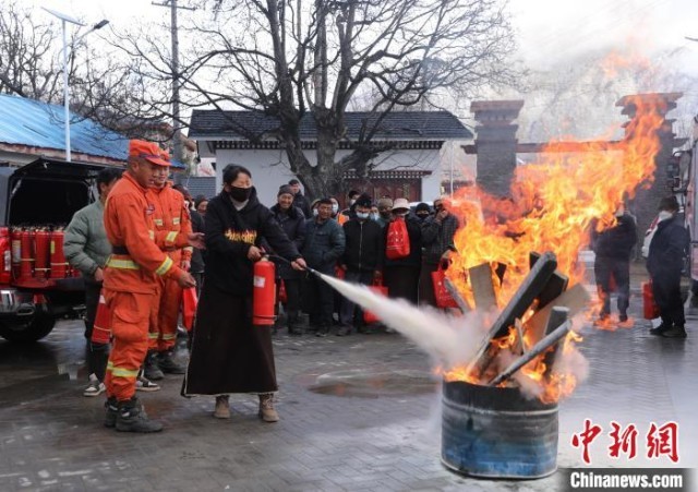 民众使用干粉灭火器灭火演练。 西绕拉翁 摄