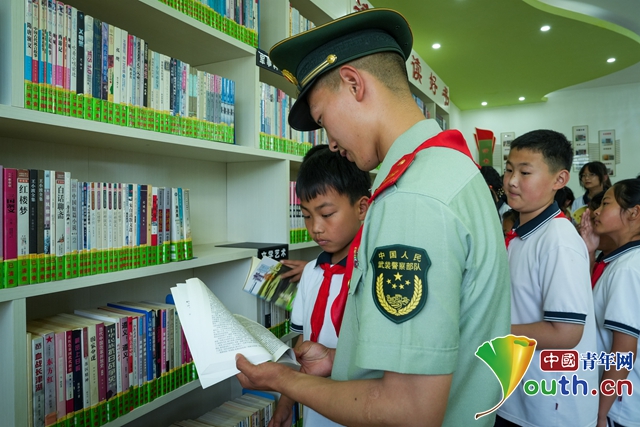 图为武警官兵为小学生讲解图书知识。中国青年网通讯员 罗骏皓摄