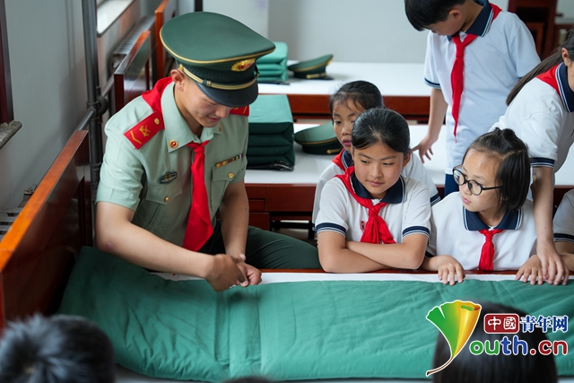 图为武警官兵为小学生示范被子折叠方式。中国青年网通讯员 罗骏皓摄
