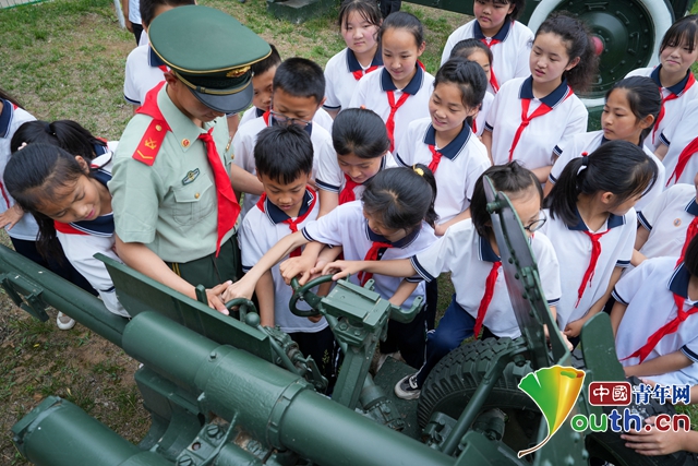 图为武警官兵为小学生讲解武器知识。中国青年网通讯员 李毓宝摄