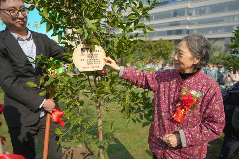 当天活动还包括《义勇军进行曲》《黄河大合唱》等歌曲演唱,以及《光荣之城》朗诵等环节。在“绿意颂和平”植树仪式中,参与者共同栽种了200余株桂花树,部分树木由新四军老战士、参加上海解放战役的开国将军和为上海各项建设事业做出贡献的人士定名挂牌,由他们的后代认养,寓意和平愿景扎根人心,红色精神生生不息。