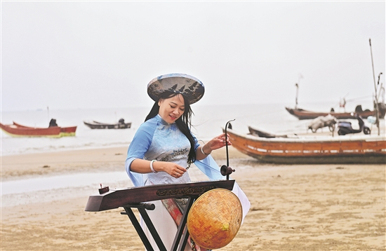 “南风吹拂,隔山又隔海,船夫划桨手已累,好酒未饮已先醉……”在东兴市金滩上,苏海珍右手拨动琴弦,左手推拉摇杆,《问月歌》悠扬婉转的旋律飘荡在海边,展现着京族独弦琴独有的艺术魅力。