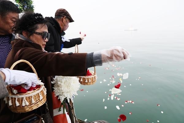 3月29日,天津,由北京市、天津市、河北省三地民政部门联合主办的“碧海寄情,爱在沧溟”——2026年京津冀骨灰海葬启航活动在天津渤海湾举行。图为逝者家属撒花纪念逝者。中新社记者 王紫儒/摄