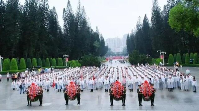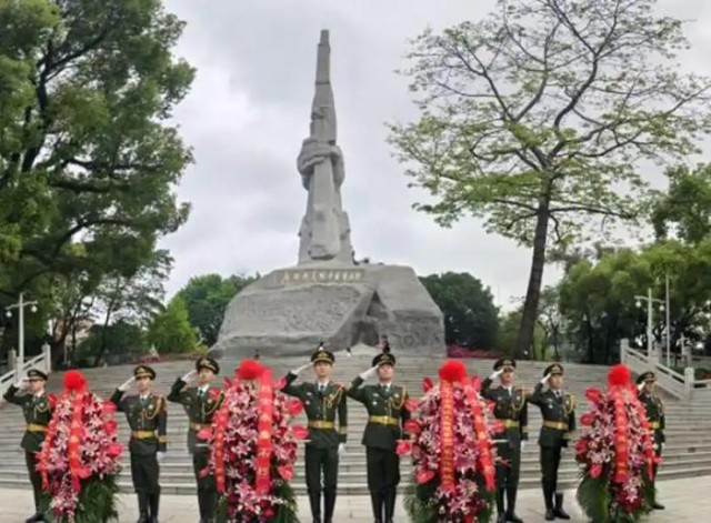 春雨潇潇,松柏苍翠,丰碑矗立。在庄严肃穆的广州起义烈士纪念碑前,广州市退役军人事务局机关干部、广州起义烈士后人、红棉老兵代表、广州党员志愿者、广州6所红军小学师生代表600多人整齐列队,肃立默哀。仪仗队迈着整齐有力的步伐,向广州起义纪念碑敬献花篮,向为民族解放英勇献身的革命先烈致以崇高敬意与深切哀思。